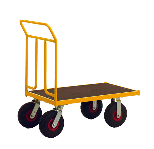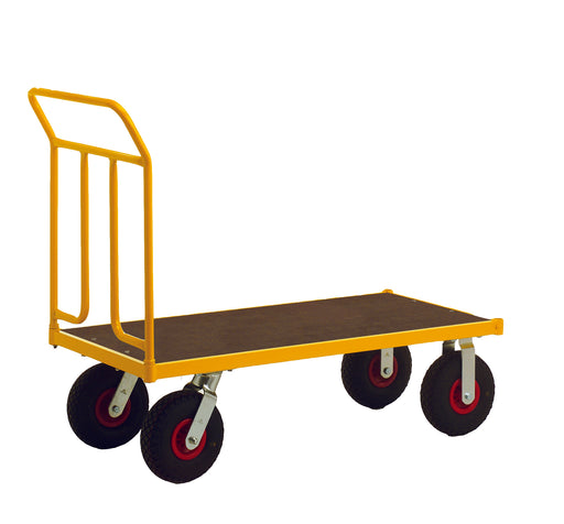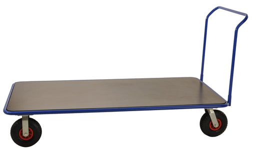 Se alla detaljerBlålackerad plattformsvagn med plywood skiva Flakets storlek 2000 x 1000 mm Höjd till lastplan 340 mm 2 fasta och 2 länkhjul luftgummi, 26...